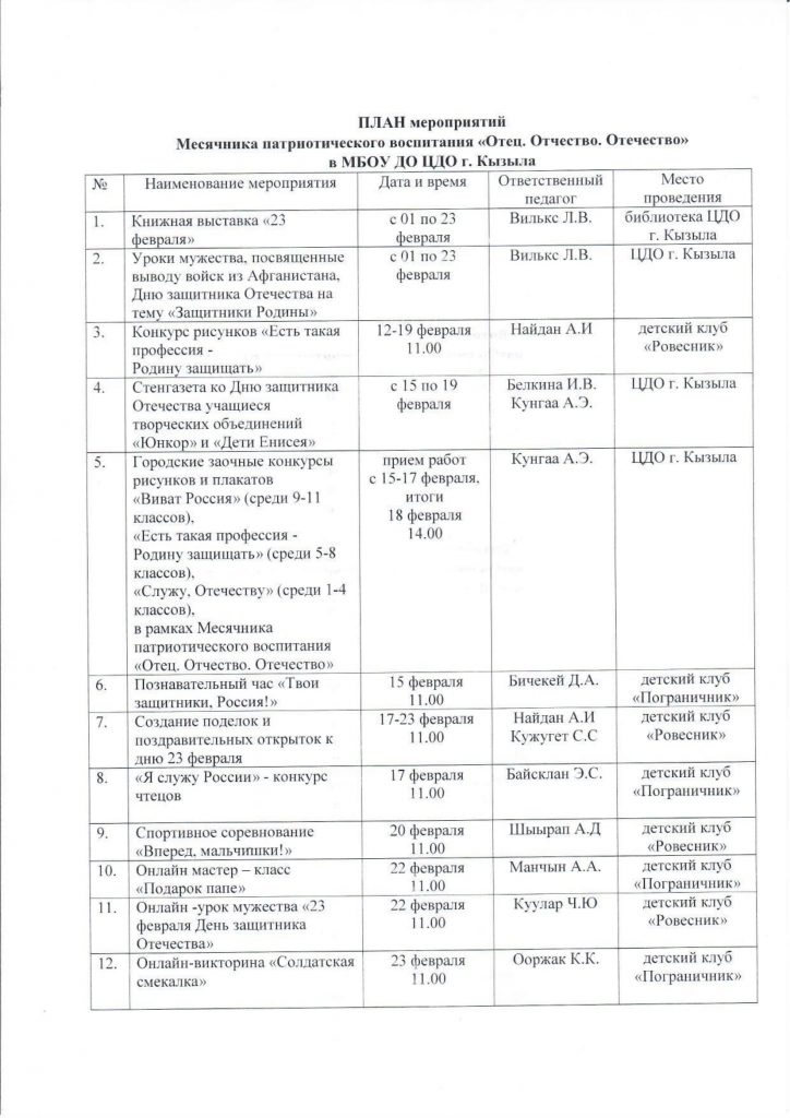 Новости План мероприятий месячника патриотического воспитания 26.01.2021 / План месячника патриотического воспитания ЦДО г. Кызыла