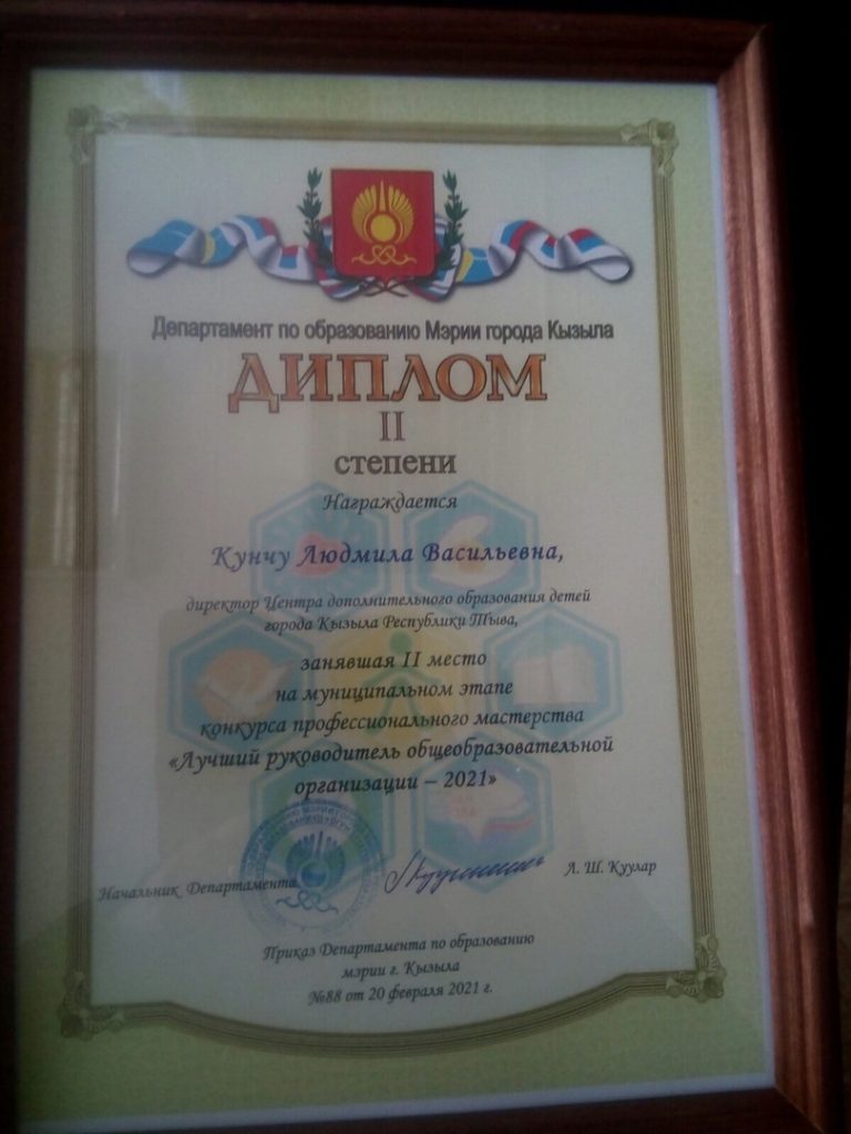 Директор Центра дополнительного образования г. Кызыла Кунчу Людмила Васильевна награждена Дипломом II степени в муниципальном этапе конкурса профессионального мастерства «Лучший руководитель общеобразовательной организации -2021».