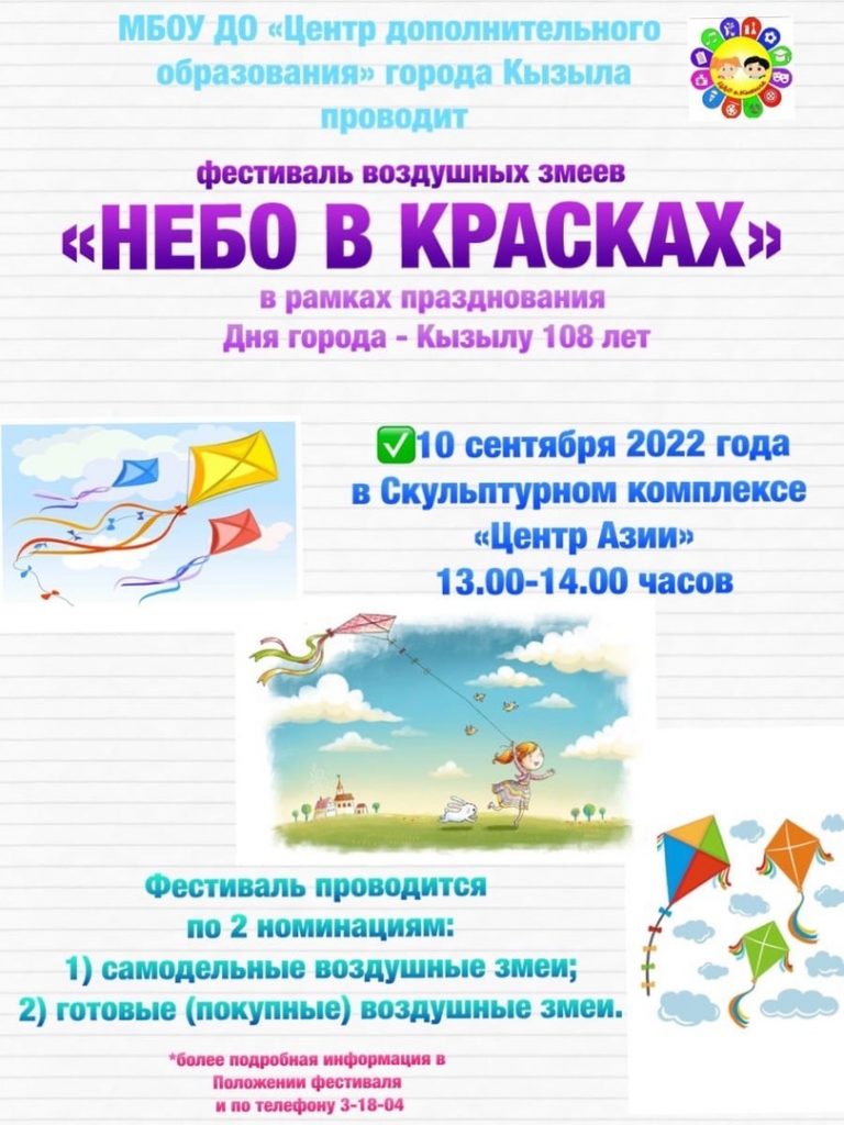 Новости Приглашаем всех жителей города Кызыла на ФЕСТИВАЛЬ ВОЗДУШНЫХ ЗМЕЕВ «НЕБО В КРАСКАХ!» 09.09.2022 /