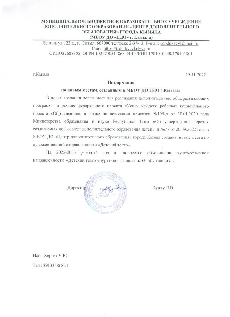 Развитие творческой личности, ее самостоятельности и инициативности – одна из актуальных задач современного образовательного процесса. Один из путей решения задачи – приобщение детей к искусству. Театр является одним из самых ярких, красочных и доступных восприятию ребенка сфер искусства. Он доставляет детям радость, развивает воображение и фантазию, способствует развитию ребенка и формированию его культуры. Эмоции способны вложить в душу ребенка все самое доброе, светлое, прекрасное. Приобщение к искусству – процесс длительный и многогранный. Необходима систематическая и целенаправленная творческая работа. Данная работа проводится в детском творческом театральном объединении «Буратино» ЦДО г. Кызыла по дополнительной общеобразовательной общеразвивающей программе «Детский театр» под руководством молодого талантливого педагога дополнительного образования Доможаковой Людмилы Александровны. Количество обучающихся — 60. В кружке проходит обучение по направлениям: актерское мастерство, основы сценического мастерства, пластика. Во время занятий дети участвуют в спектаклях, режиссируют их, примеряют роль актеров и сценаристов. Проводятся занятия по сценической речи и импровизации. Театральный кружок комплексно развивает ребенка, развивает артистизм, сценическую речь, способствует общительности, уверенности и целеустремленности, формирует общий кругозор ребенка.
