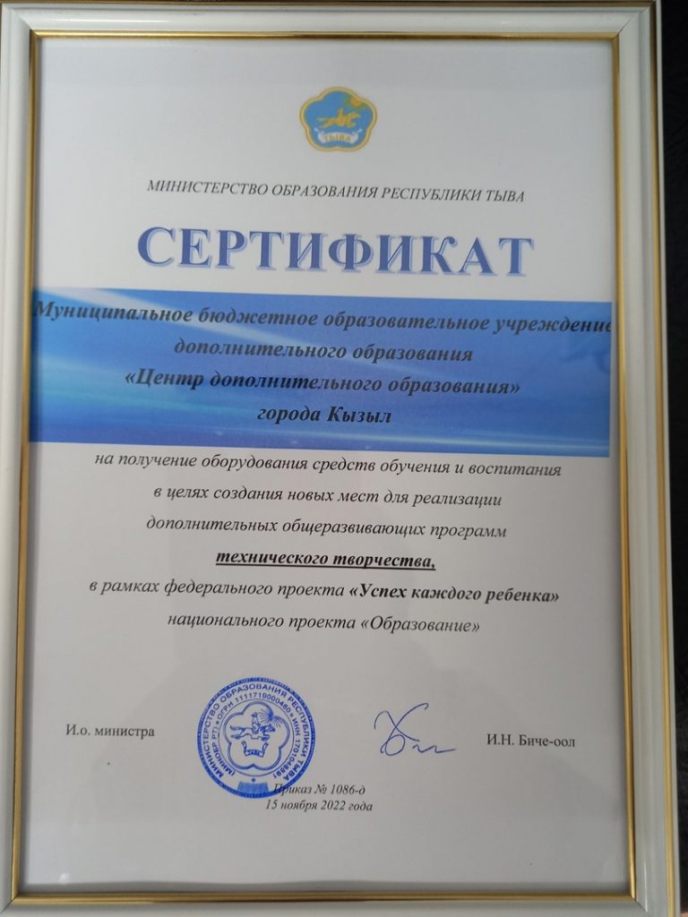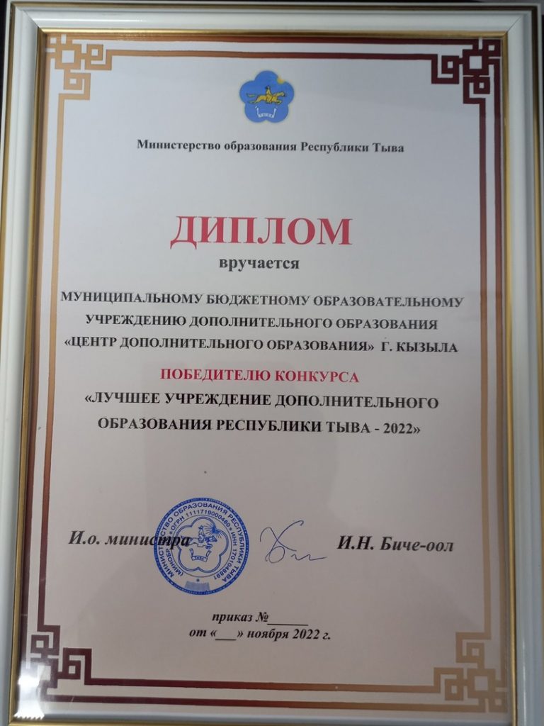 В этом учебном 2022-2023 году Центру дополнительного образования города Кызыла присвоено звание «Лучшее учреждение дополнительного образования Республики Тыва – 2022» по итогам республиканского конкурса «Лидеры дополнительного образования Республики Тыва – 2022», проходившим под девизом «Эффективная работа системы дополнительного образования – гарантия целостного образования детей».