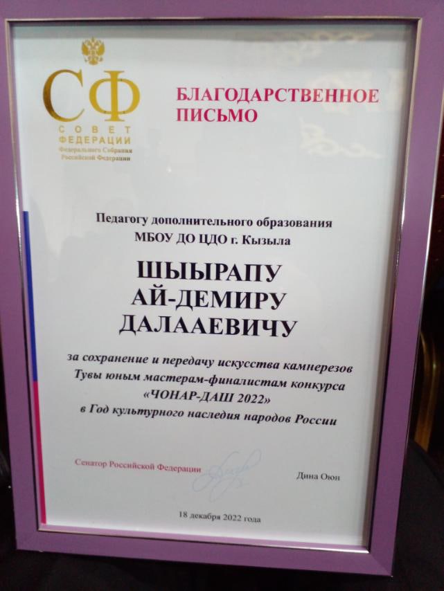 В Кызылском Президентском кадетском училище прошел Республиканский конкурс камнерезного искусства «Чонар-Даш-2022″ среди учащихся 5-11 классов. В финальную часть прошли обучающиеся из объединения » Сарыг-Хая» под руководством Шыырап А-Д.Д. Дипломом 2-й степени в возрастной категории 9-11 кл. награжден Ооржак Тумен-Байыр; Дипломом 3 степени в возрастной группе 5-8 кл награжден Балчыр Аслан. Монгуш Ария и Монгуш Аюш удостоены номинаций «Мой ласковый и нежный зверь» и За любовь к Родине». Поздравляем участников и педагога с достигнутыми успехами!