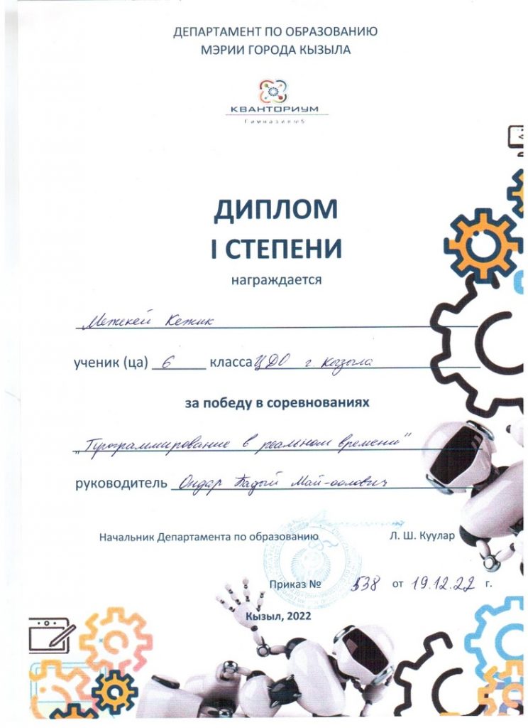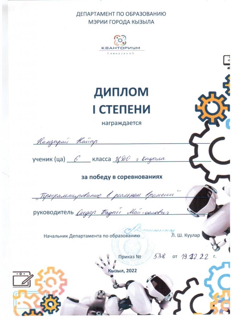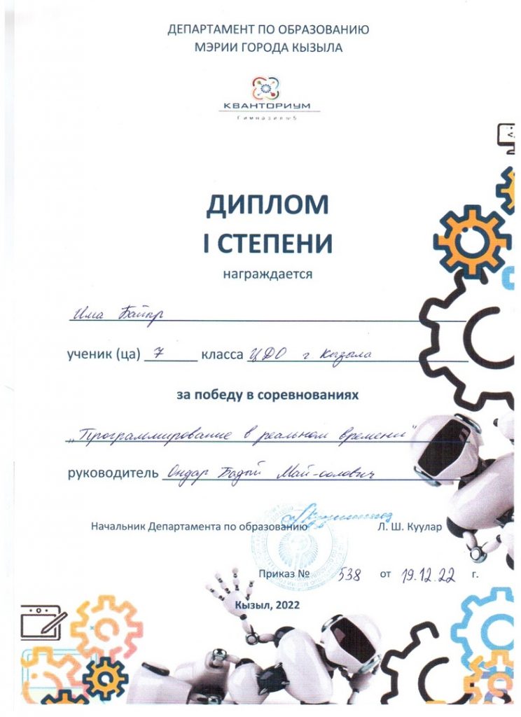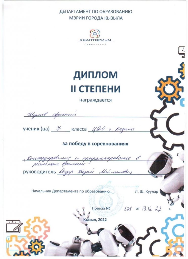 17 декабря в МБОУ «Гимназии № 5» проходило городское научно-техническое соревнование «Юный робототехник». Команда обучающихся ЦДО из объединения «РОБОТОТЕХНИКА» под чутким руководством педагога Ондара Бадый Май-ооловича достойно представили свои работы и в результате получили заслуженные дипломы. ПОЗДРАВЛЯЕМ!!!