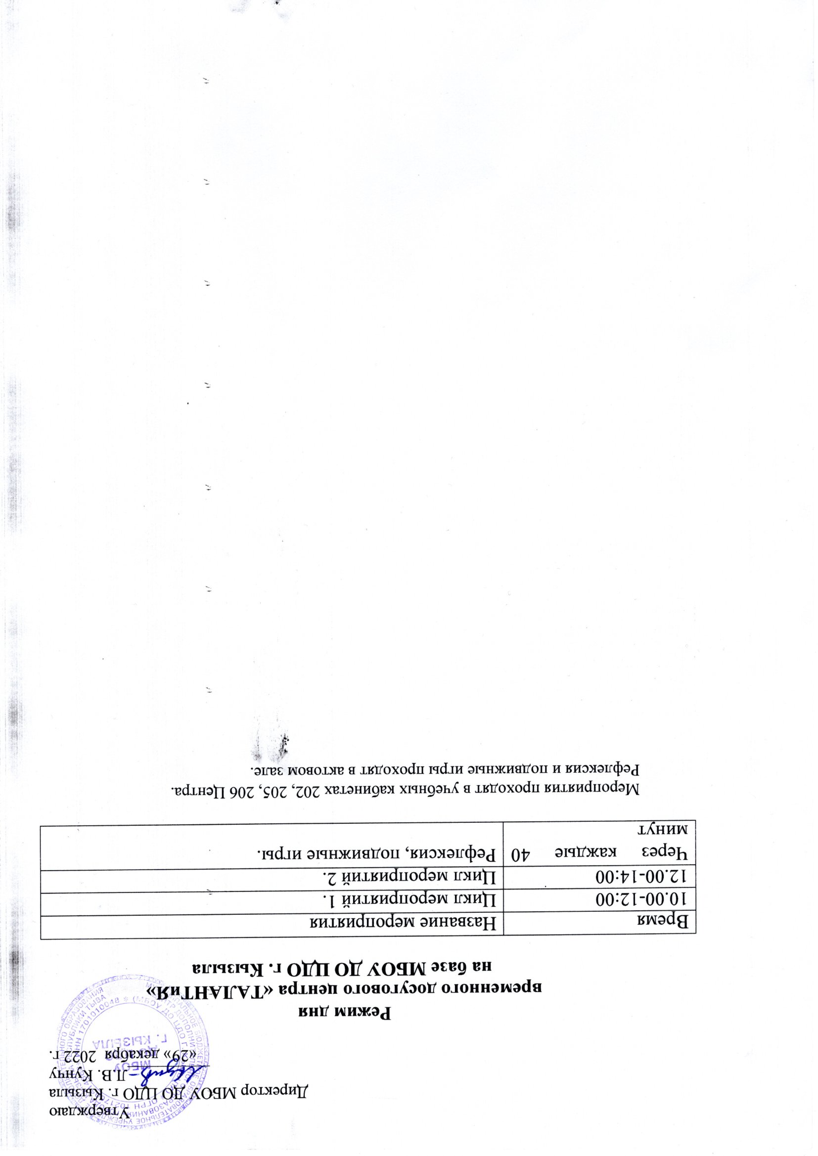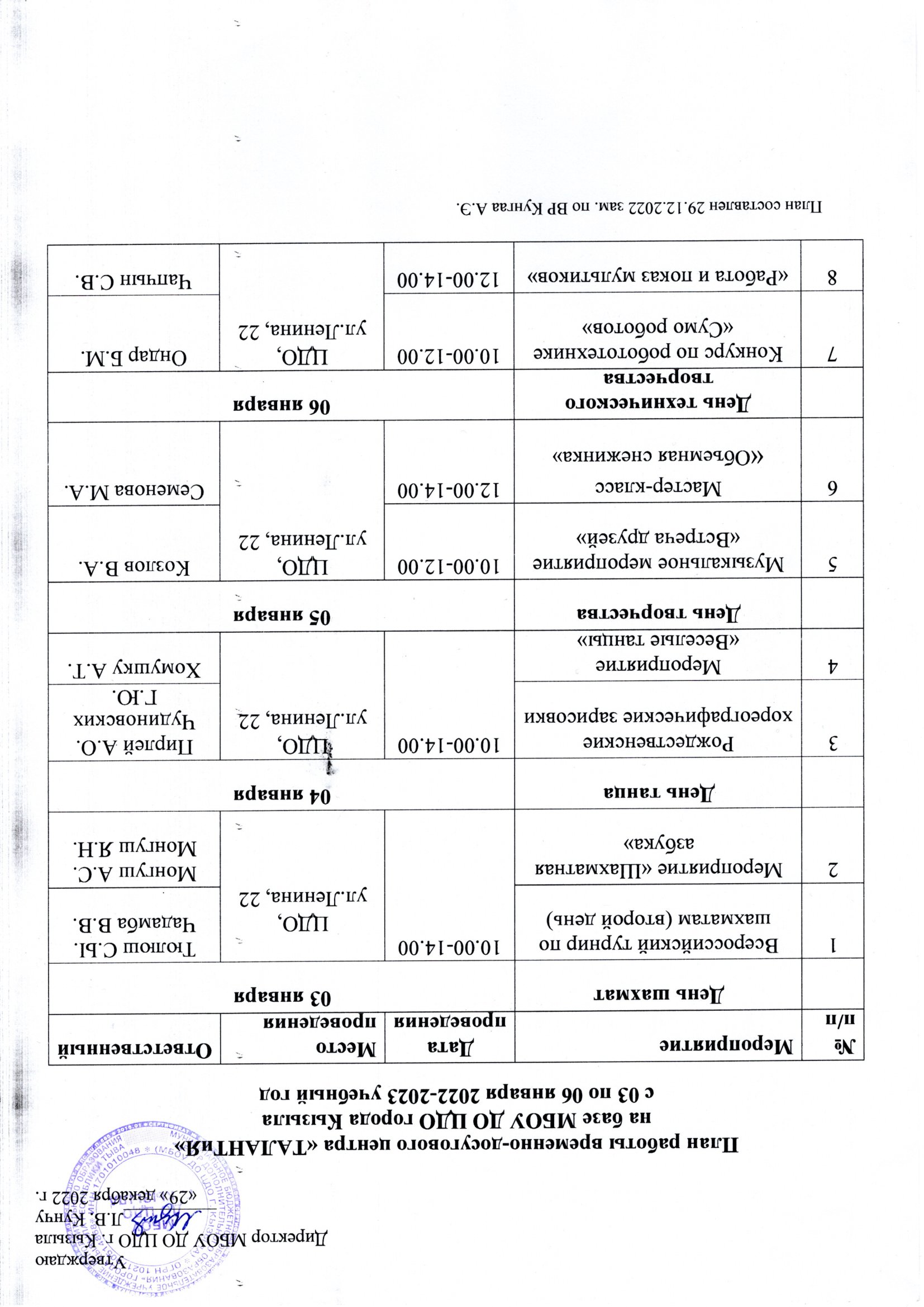 Новости Временно-досуговый центр «ТАЛАНТиЯ» МБОУ ДО ЦДО г.Кызыла. 30.12.2022 / План работы ВДЦ ЦДО зима 2023Скачать Приказ ВДЦ ЦДО зима 2023Скачать Режим дня ВДЦ ЦДО зима 2023 (2)Скачать Список детей ВДЦ зима 2023.2Скачать Список дети ВДЦ ЦДО зима 2023.1Скачать