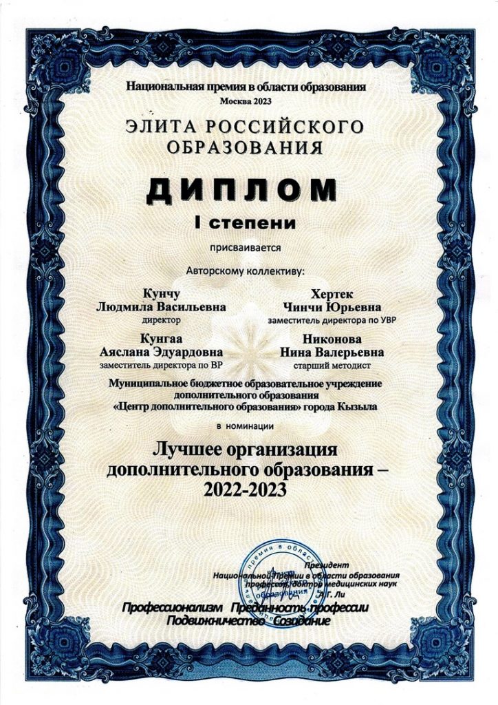 МБОУ ДО ЦДО г. Кызыла удостоен Национальной Премии «Элита Российского образования» I степени в конкурсе инноваций: «Качественное образование — будущее России» в номинации «Лучшая организация дополнительного образования 2022-2023». Это высшая общественная награда за выдающиеся успехи в области образования.