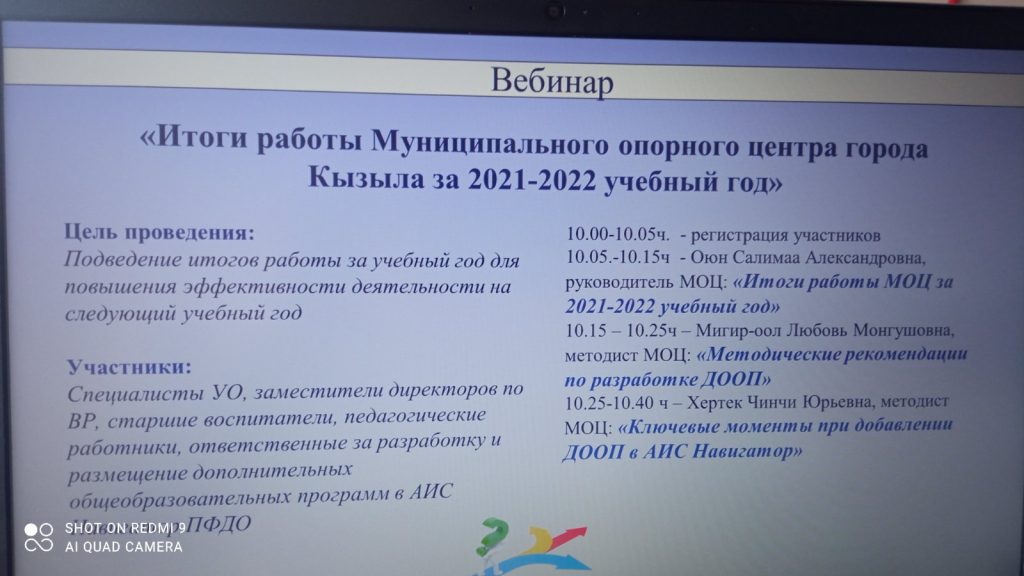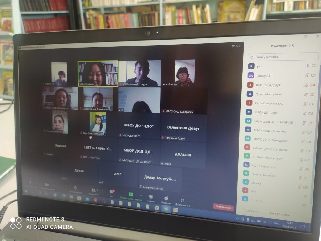 26 и 28 апреля Муниципальным опорным центром проведены вебинары по теме» Итоги работы за 2021-2022 учебный год » с целью подведения итогов работы за учебный год для повышения эффективности деятельности на следующий учебный год. Участвовали специалисты УО, заместители директоров по ВР, старшие воспитатели, педагогические работники, ответственные за разработку и размещение дополнительных общеобразовательных общеразвиваюших программ г. Кызыла, Кызылского, Каа-Хемского, Пий-Хемского, Тоджинского муниципалитетов и методист РМЦ ГБОУ ДО РТ Найдина Е.В.